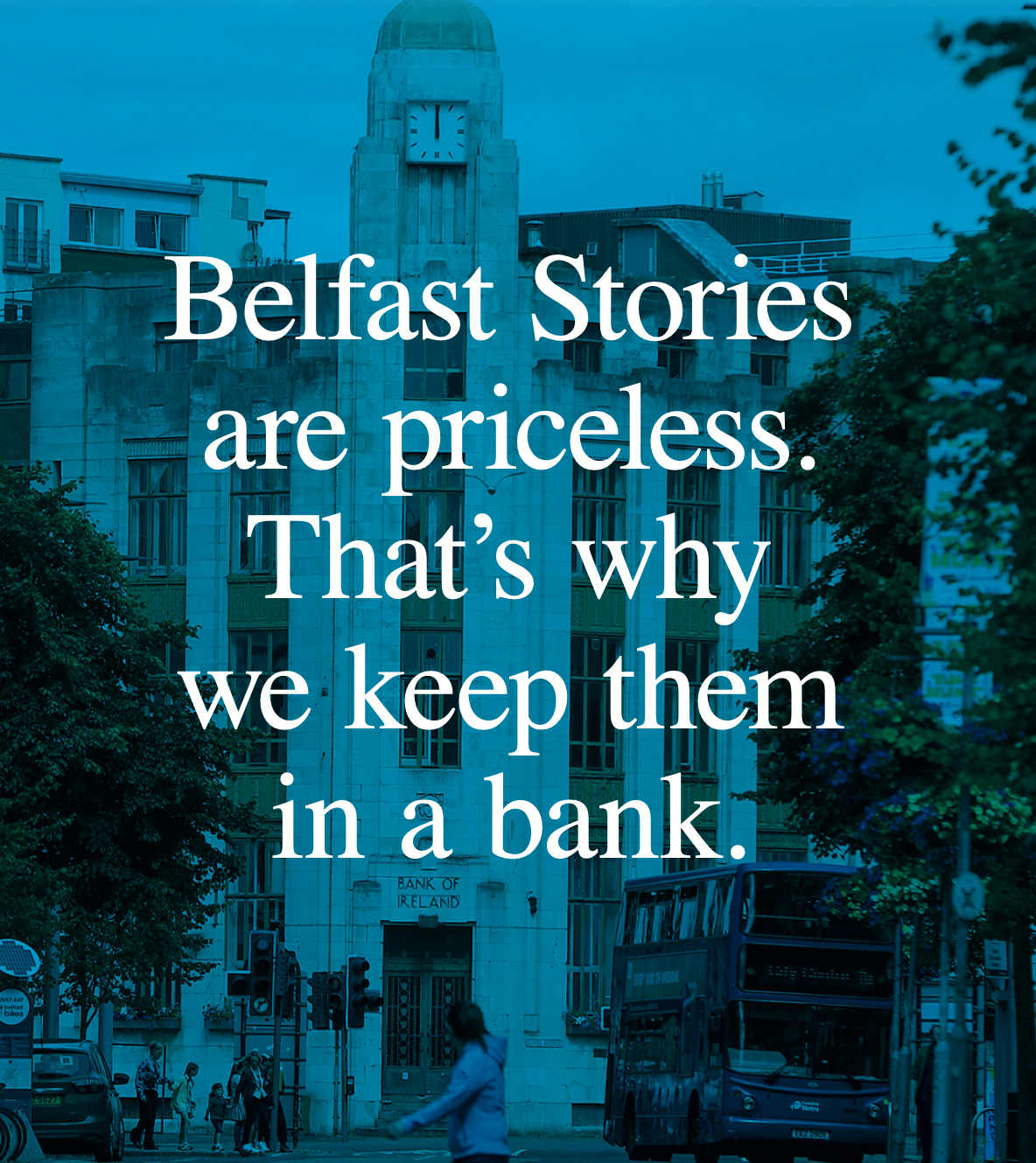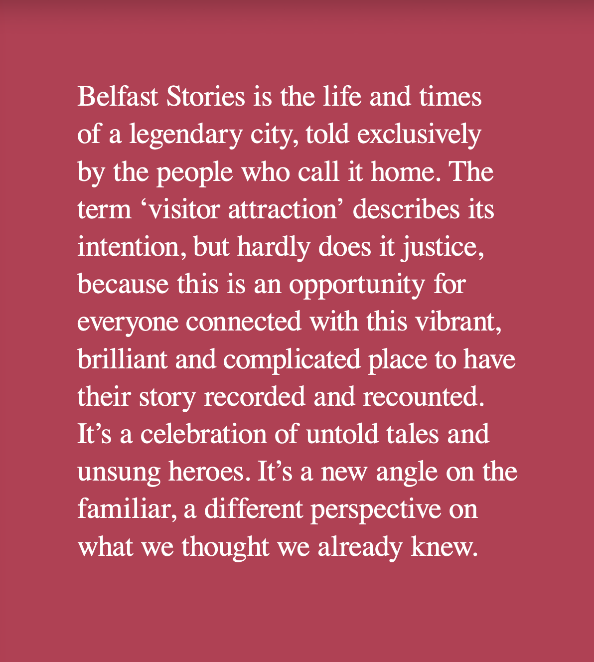 Belfast Stories is a complex project rooted in a simple idea. By gathering the individual stories of the people who have lived in or visited Belfast, it hopes to capture its unique spirit. The focus for it will be in a converted, iconic city centre building that used to be a bank. I wrote the tone of voice for Belfast Stories and messaging for the City Council’s consultation document, some of which is shown here.