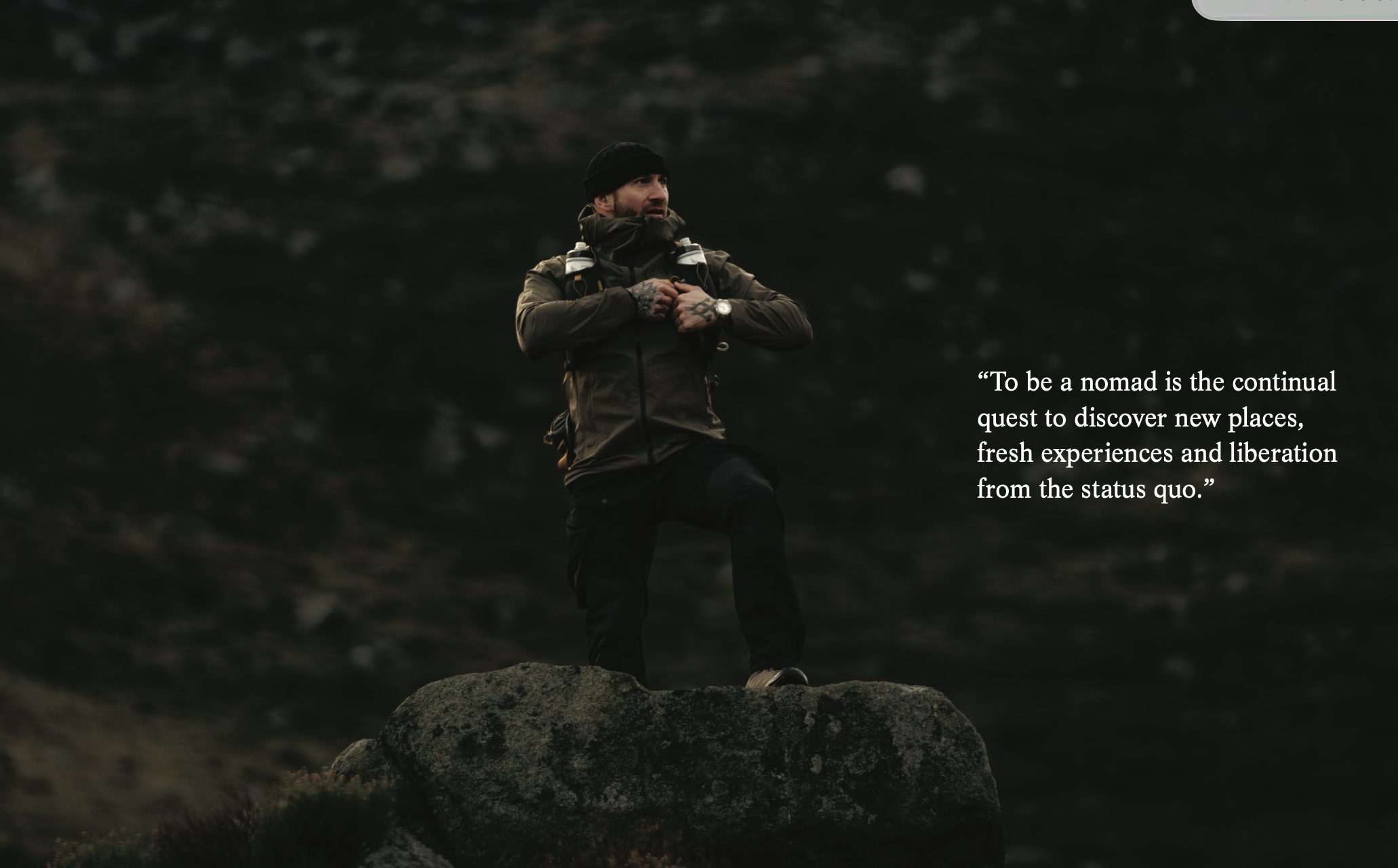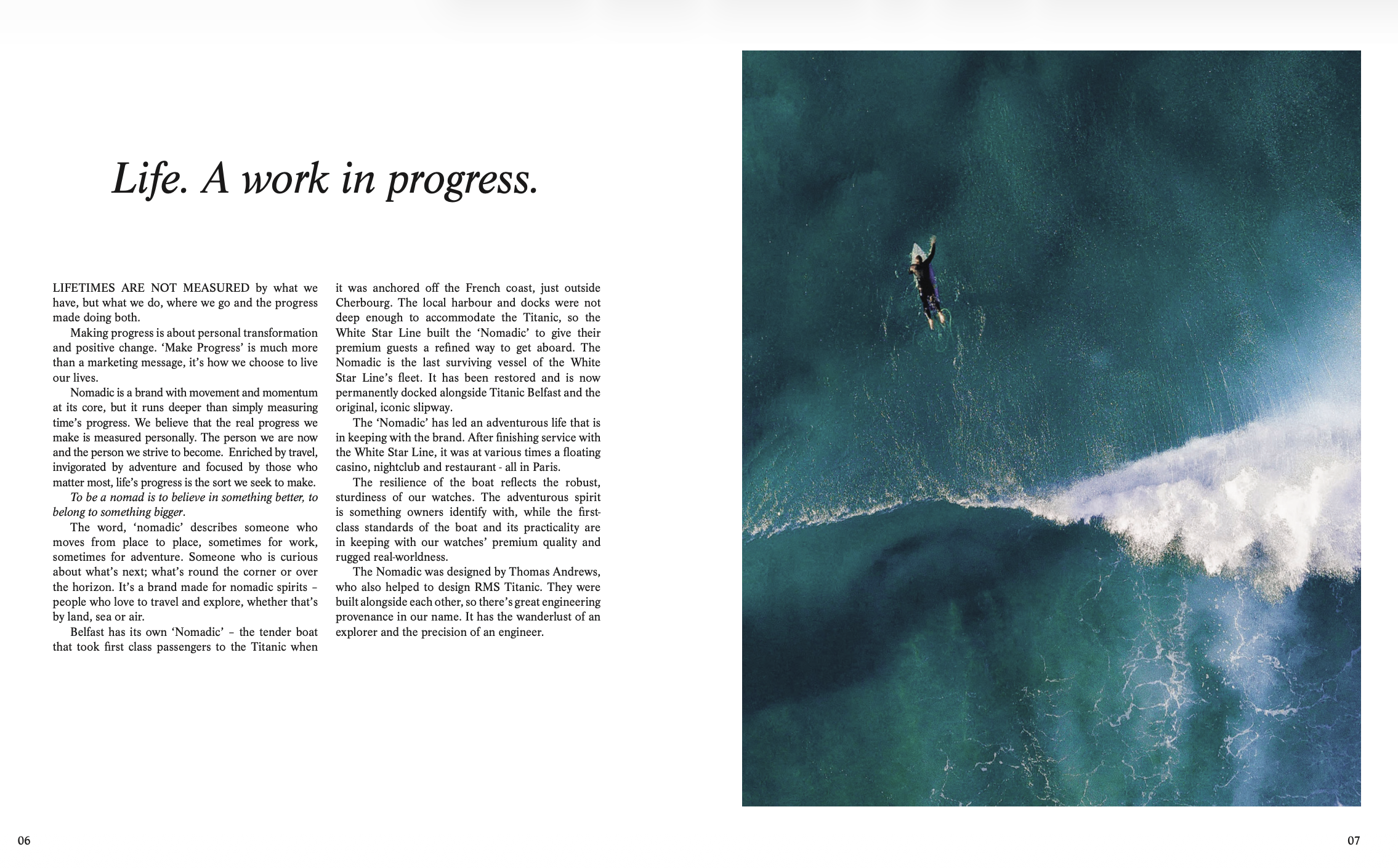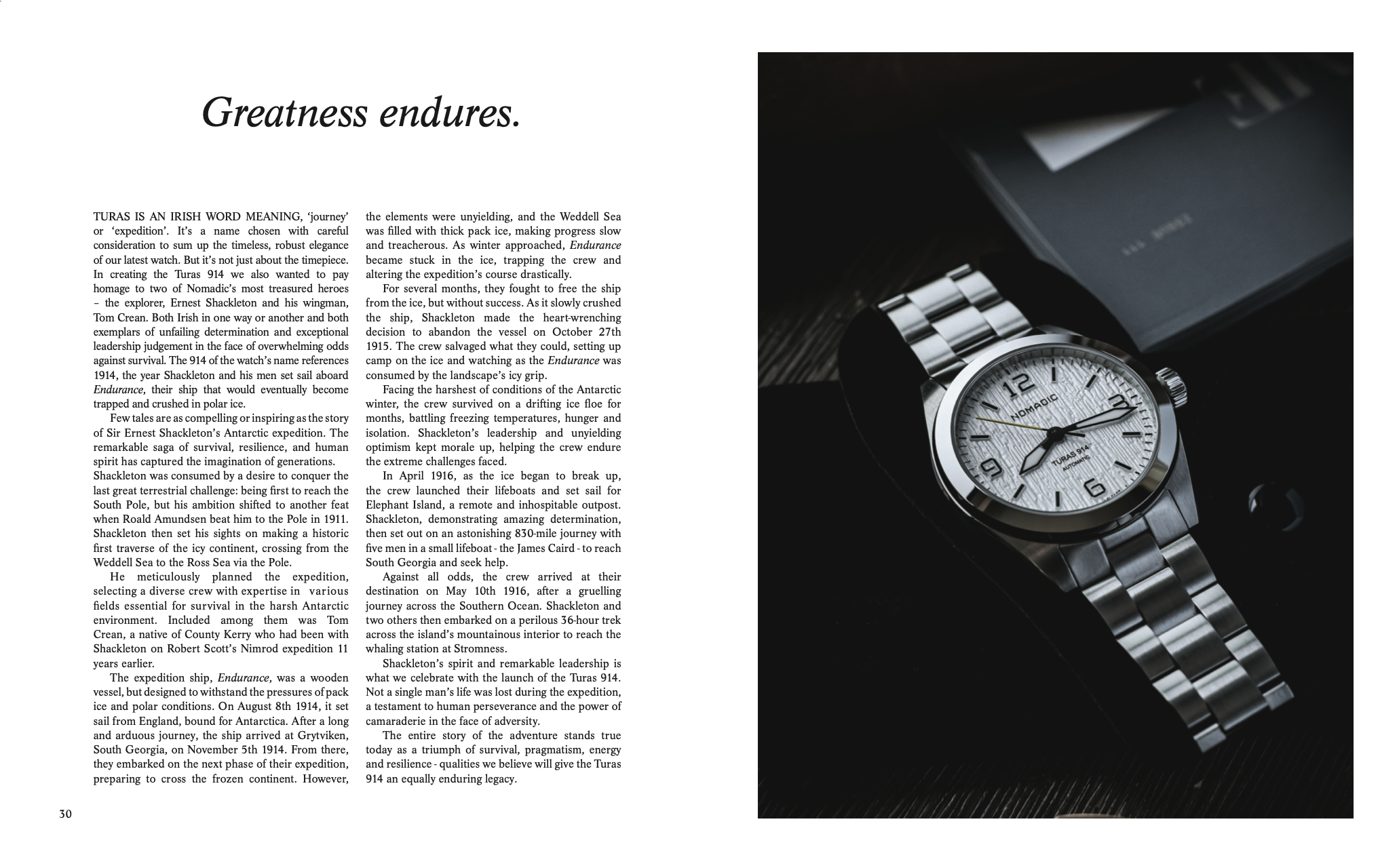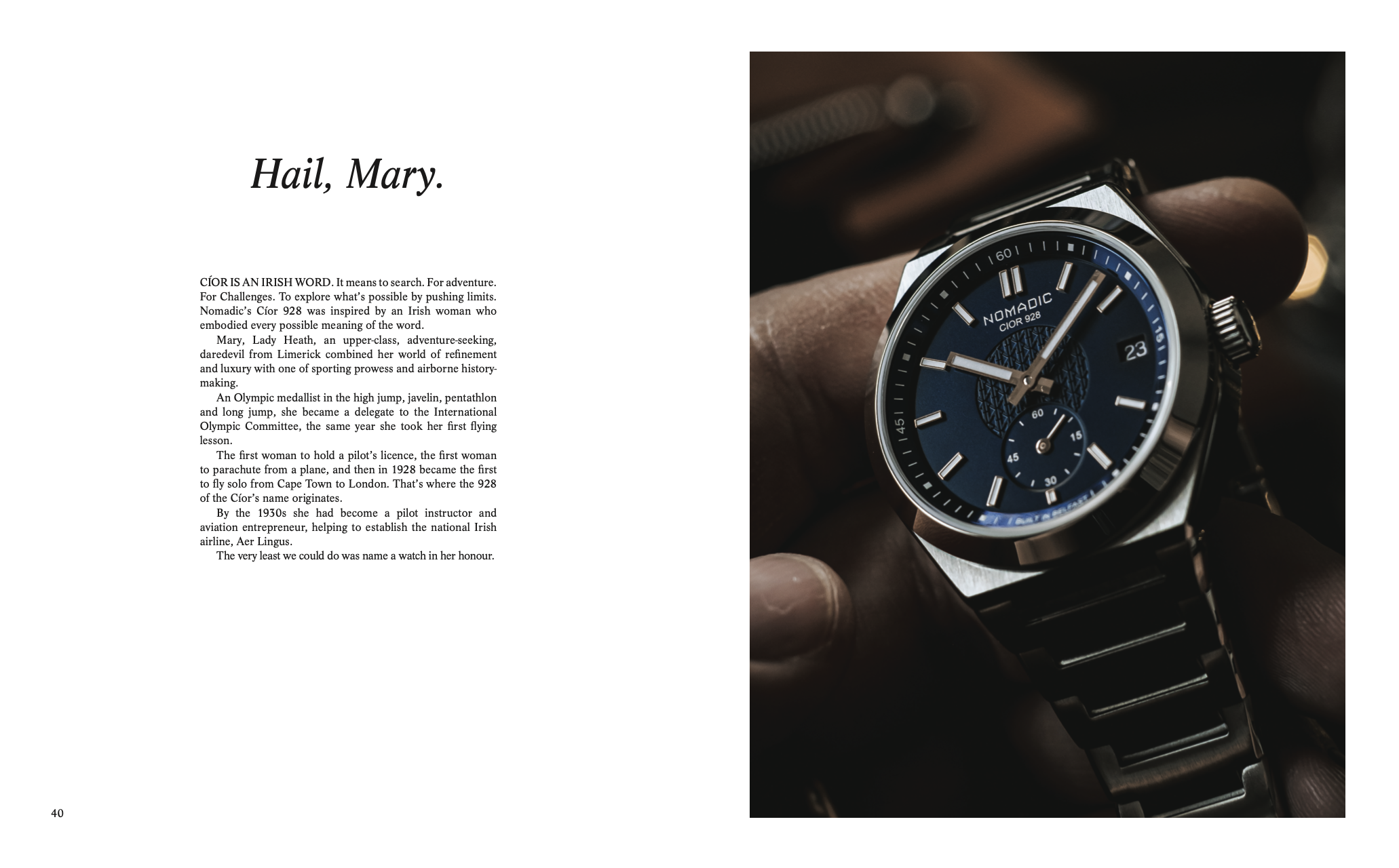 Nomadic designs and builds luxury, adventure-ready watches in Belfast. Each model draws inspiration from historic Irish feats of endeavour, reflected in the watch names and origin stories. These spreads are taken from a book celebrating the brand’s first three years.